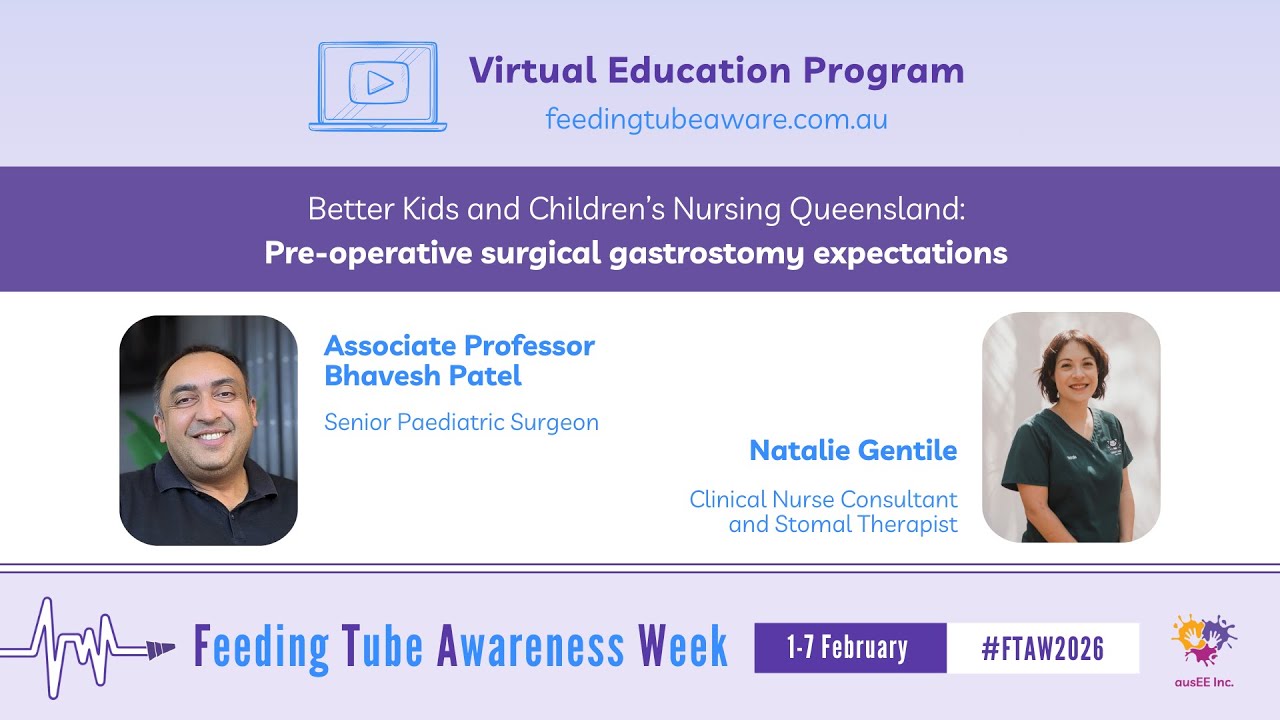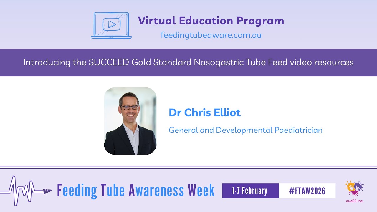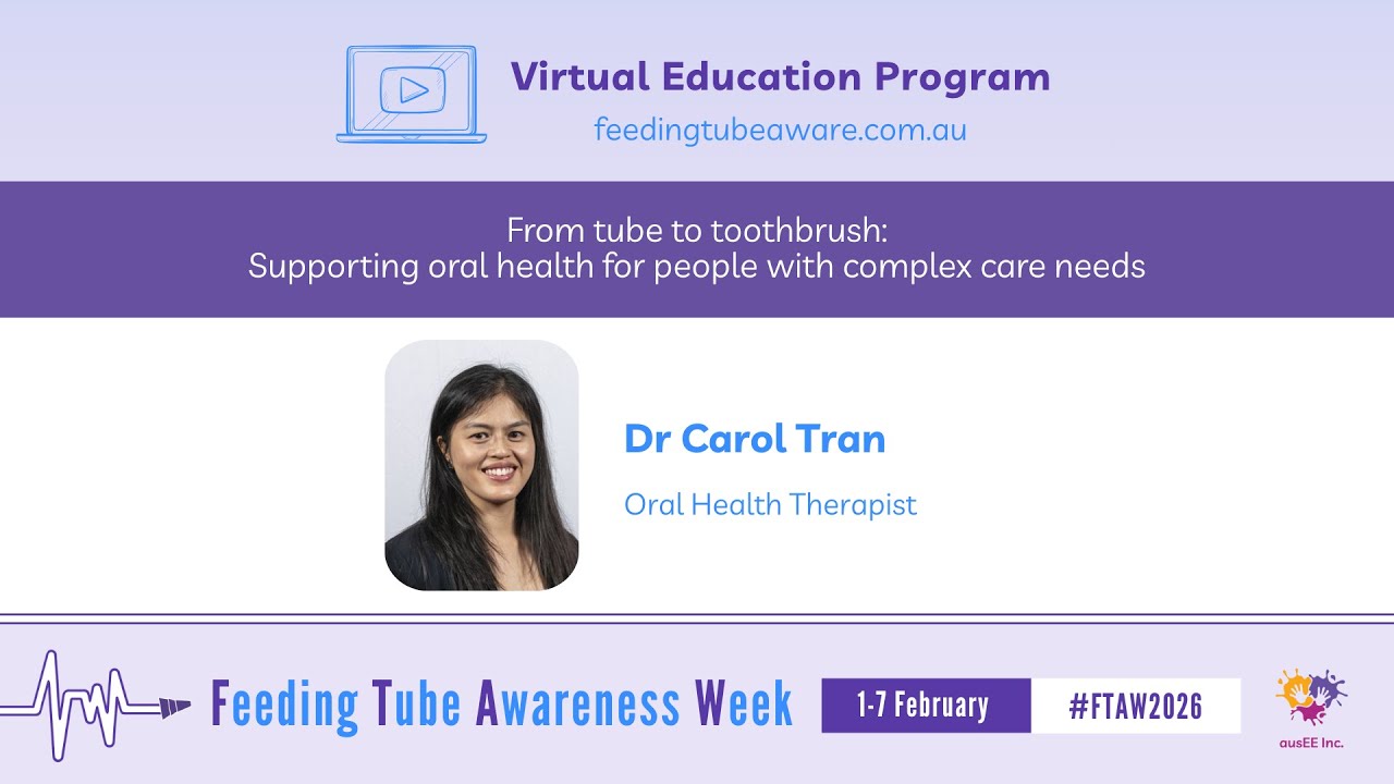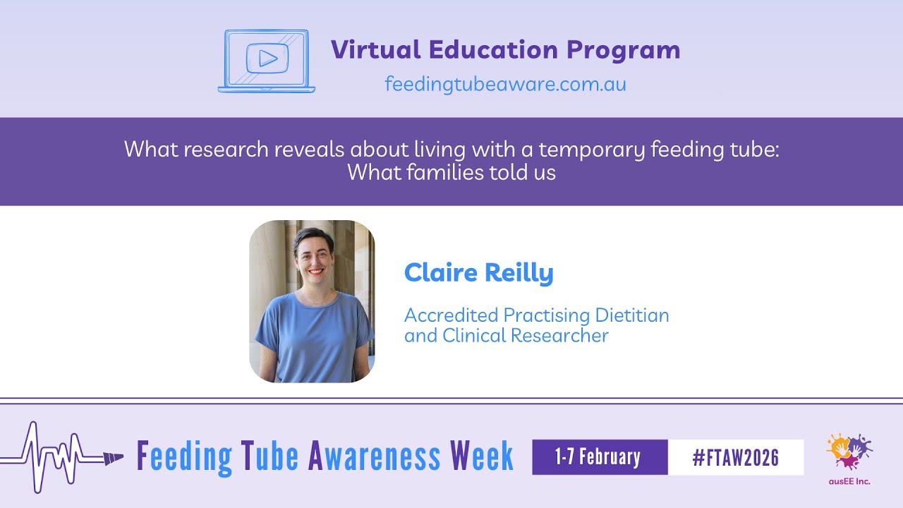 Each day during Feeding Tube Awareness Week (1-7 February 2026) at 8am AEST/ 9am AEDT, new video content will be released on our YouTube channel featuring tube-feeding specialists and people with lived experience. The videos will be shared across our social media pages and will be available for viewing from this page. All videos will remain accessible for on-demand viewing. We sincerely thank everyone who contributed their expertise to create these videos for this free Virtual Education Program. Their commitment to educating and supporting the tube-feeding community is deeply appreciated.